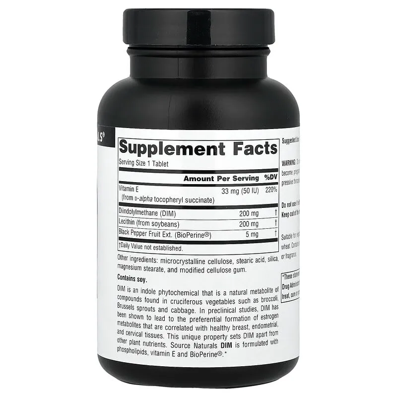 Ce complément est enrichi en phospholipides, vitamine E et BioPerine® pour une meilleure absorption et efficacité. Il convient parfaitement à ceux qui souhaitent soutenir leur équilibre hormonal naturellement, tout en bénéficiant d’un produit sans levure, sans produits laitiers, œufs, gluten ni blé. Source Naturals DIM contient du soja, il est donc important de vérifier toute allergie éventuelle.